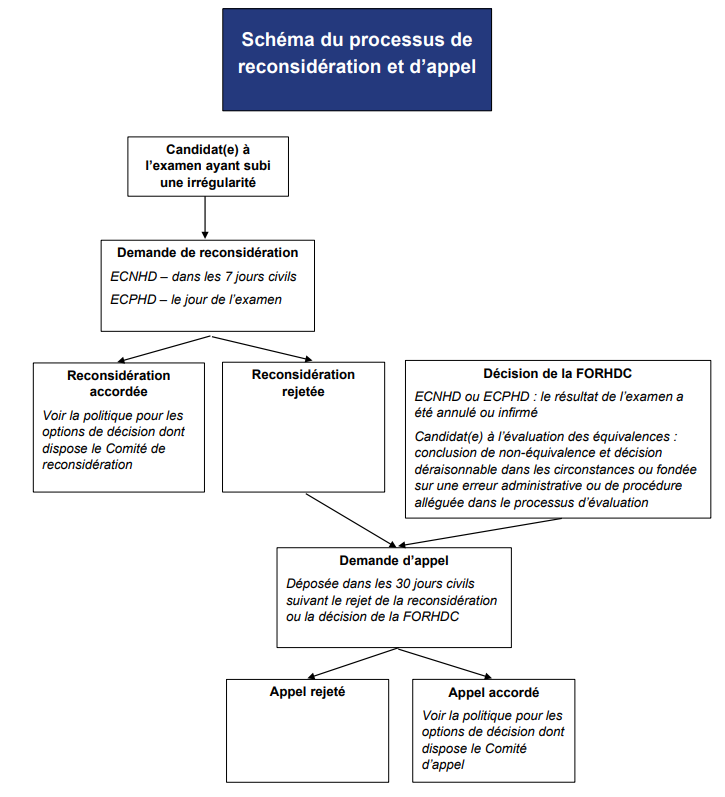 Un(e) candidat(e) ayant subi une irrégularité doit soumettre une demande de reconsidération au plus tard 7 jours civils après la date de l’examen. La demande de reconsidération doit être envoyée par écrit (par courriel ou par la poste), accompagnée des frais administratifs appropriés, indiquer les motifs de la demande de reconsidération et inclure, le cas échéant, tout document justificatif pertinent. Une demande de reconsidération est considérée comme ayant été soumise à la date de sa réception par la FORHDCMC.
